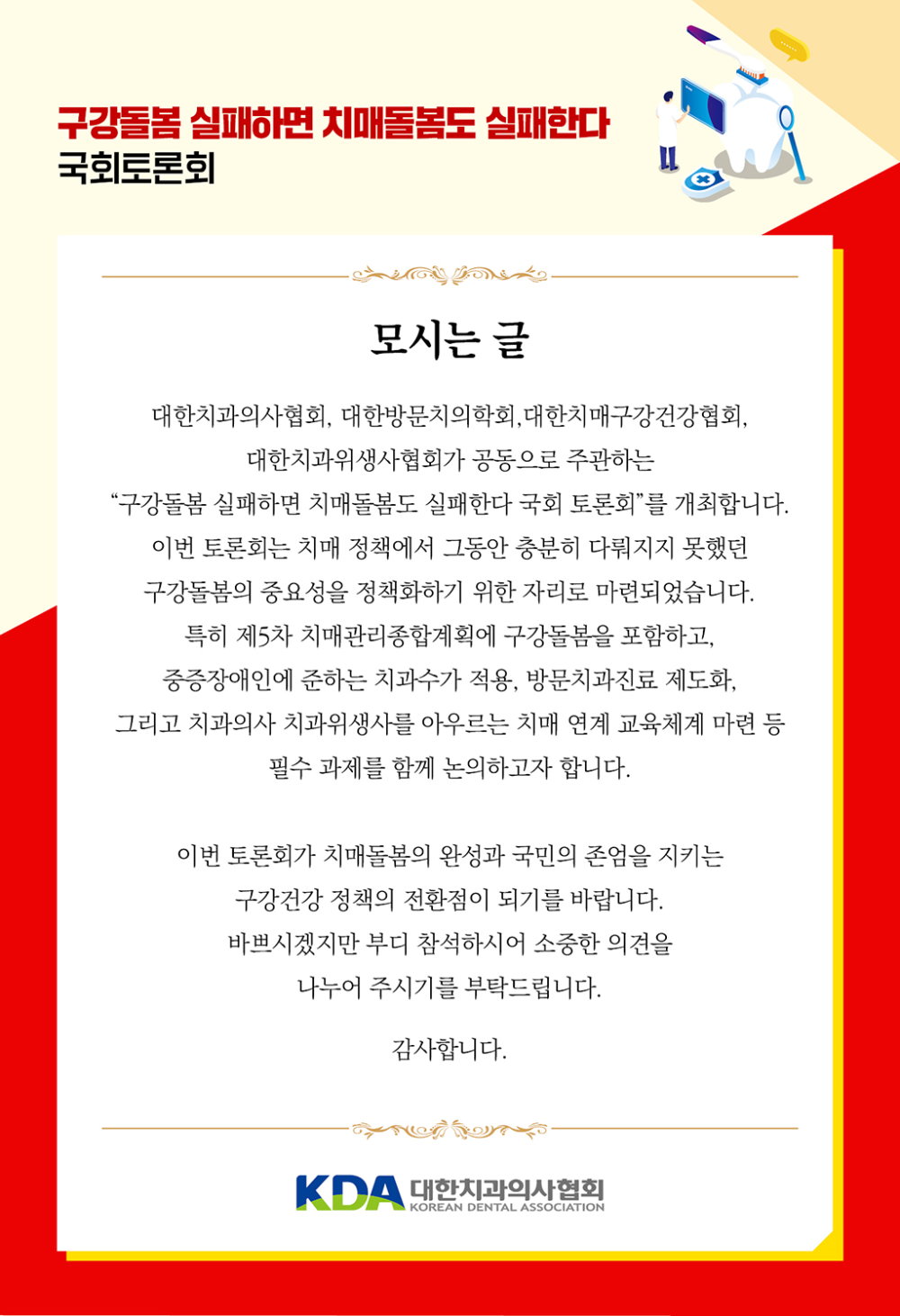 국회토론회 "구강돌봄 실패하면 치매돌봄도 실패한다" 페이지 정보 작성자 백희숙 댓글 0건 조회 62회 작성일25-11-17 10:44 본문 "구강돌봄 실패하면 치매돌봄도 실패한다" 댓글목록 목록 Total 333건 1 페이지 공지사항 목록 번호 제목 글쓴이 날짜 2025 대한여성치과의사회 학술대회 관리자. 1831 08-14 제 39차 대한여성치과의사회 정기총회 백희숙 527 02-25 대한여성치과의사회 제2기 학생홍보기자 모집 사무국 405 02-24 댓글에 링크 달아놓은것 클릭 금지 백희숙 328 02-22 제25대 대여치 2025년 행사일정 백희숙 357 02-22 < 대한여성치과의사회 X 현대백화점> 제휴혜택 안내 박쥐연못 1363 06-10 회원ID/ 비번 찾기 안내 백희숙 613 06-05 대한 여성치과의사회 여성 인권센터에서 알려드립니다 김현정 1376 08-31 대한여성치과의사회 연회비의 DV 포인트 적립 안내 김현정 643 08-16 324 대한방문치의학회 창립식 및 정책토론회 백희숙 24 12-15 323 제26대 대한여성치과의사회 회장, 수석부회장 후보 등록 및 추천위원회 소집 사무국 68 12-02 322 방문 치과 진료, 어떻게 준비 할 것인가 백희숙 63 11-29 321 제32회 덴탈코러스 정기연주회 백희숙 55 11-18 320 벤츠 코리아와 업무협약 체결 백희숙 93 11-18 열람중 국회토론회 "구강돌봄 실패하면 치매돌봄도 실패한다" 백희숙 63 11-17 열린1페이지 2페이지 3페이지 4페이지 5페이지 6페이지 7페이지 8페이지 9페이지 10페이지 다음 맨끝 검색대상 제목 내용 제목+내용 회원아이디 회원아이디(코) 글쓴이 글쓴이(코) 검색어 필수 검색